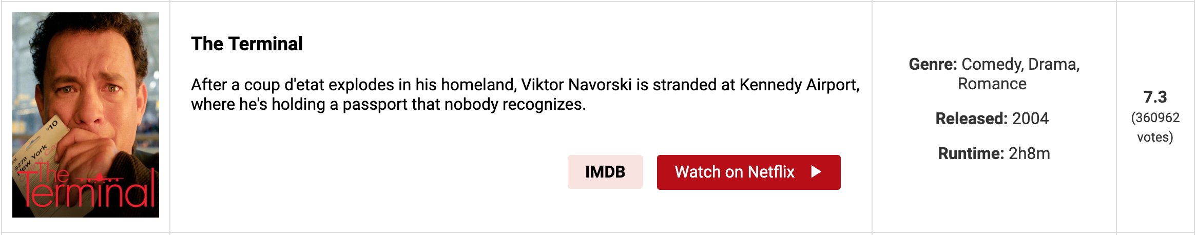 저는 이날 갑자기 The Terminal에 꽂혀서 검색을 해보니 다행히 나오네요. 바로 Watch on Netflix를 클릭합니다.