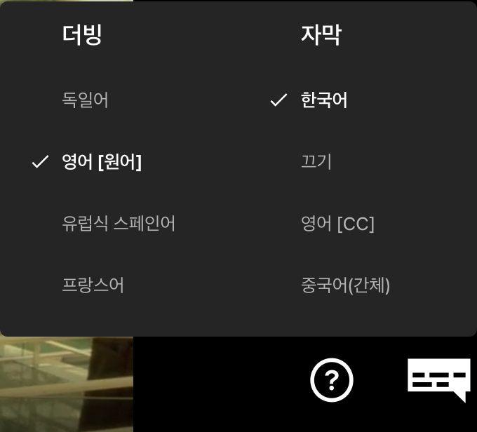 우선 LLN 화면 위 영역을 보면 아래와 같이 넷플릭스 화면에서 자막 아이콘이 보입니다.(이미지 우측 하단 아이콘 클릭)