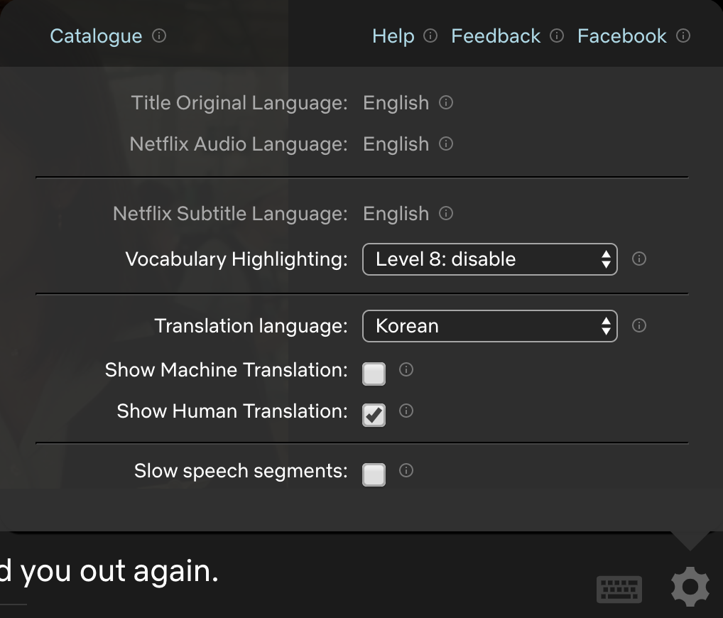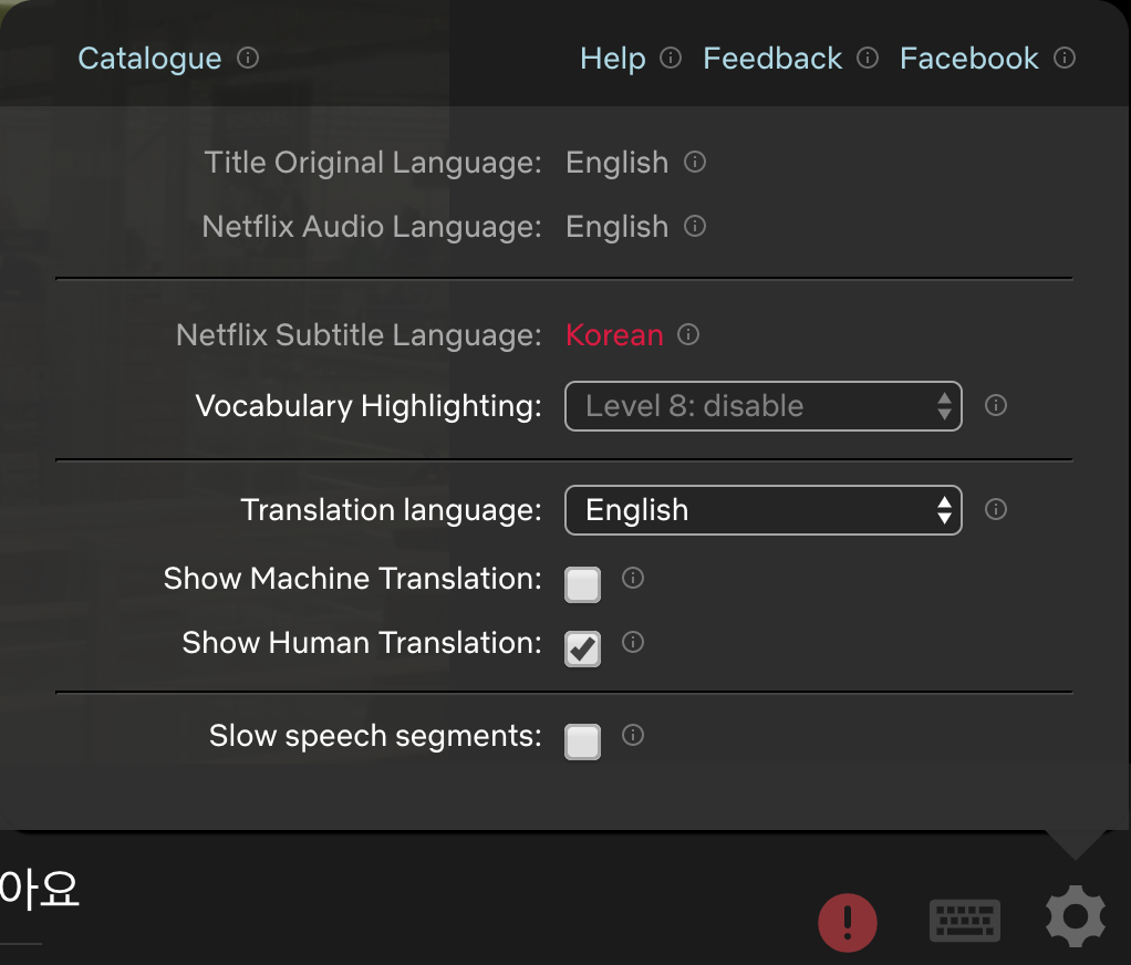 그리고 다시 LLN 환경 설정을 하기위해 톱니바퀴(아래 이미지 우측 하단) 클릭하고 Translation language를 English에서 Korean 으로 변경합니다.